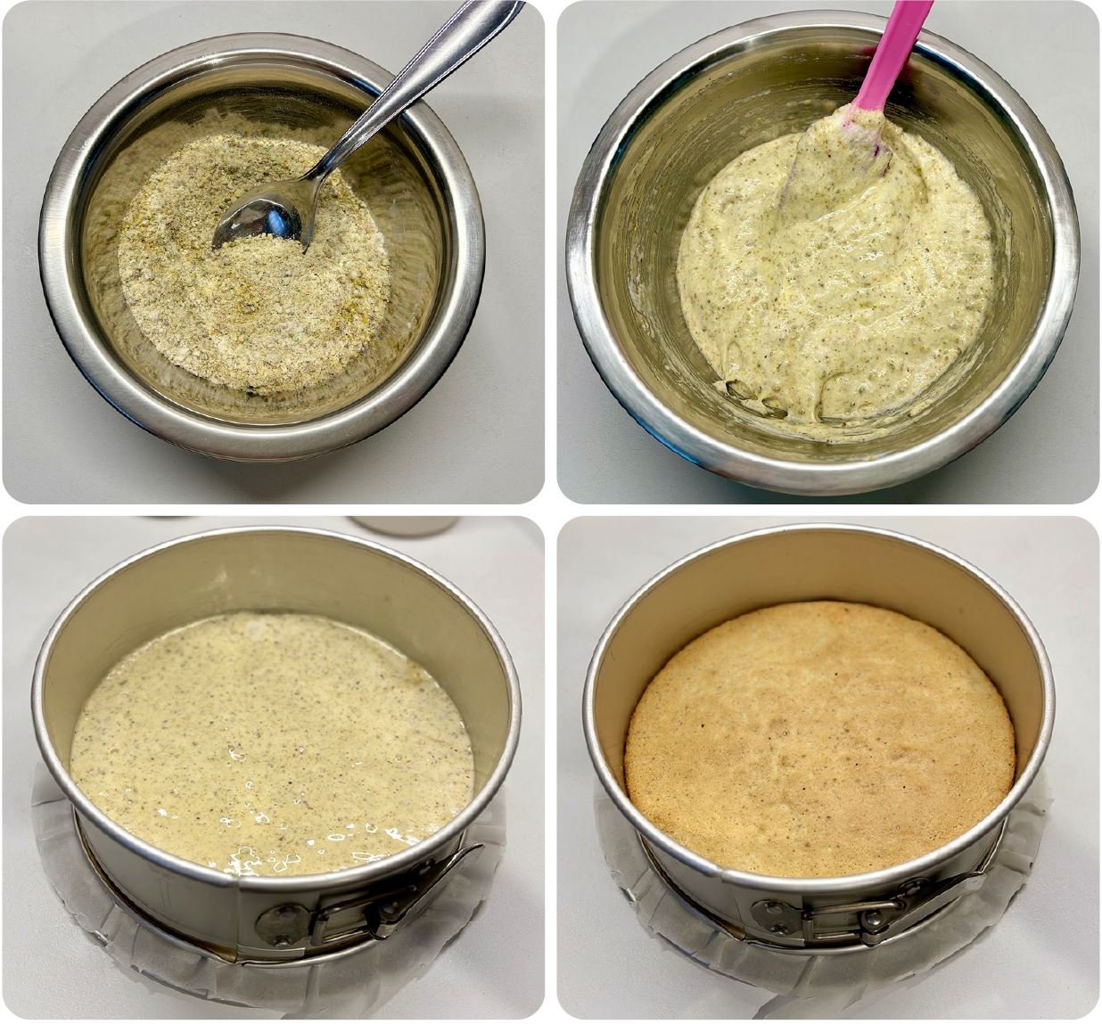 1. A piskótához a pisztáciát késes aprítóban ledaráljuk, és a liszttel összekeverjük. A tojások fehérjét 20 g cukorral habbá verjük. A sárgáját a maradék cukorral kihabosítjuk, miközben hozzáöntjük az olajat is. A száraz hozzávalókat és a felvert fehérjét felváltva adagolva forgatjuk a sárgájához. Egy 24 cm-es tortaforma alját sütőpapírral kibéleljük, és a masszát beleöntjük. Előmelegített, 175 fokos sütőben kb. 20-25 perc alatt megsütjük. Hagyjuk kihűlni.