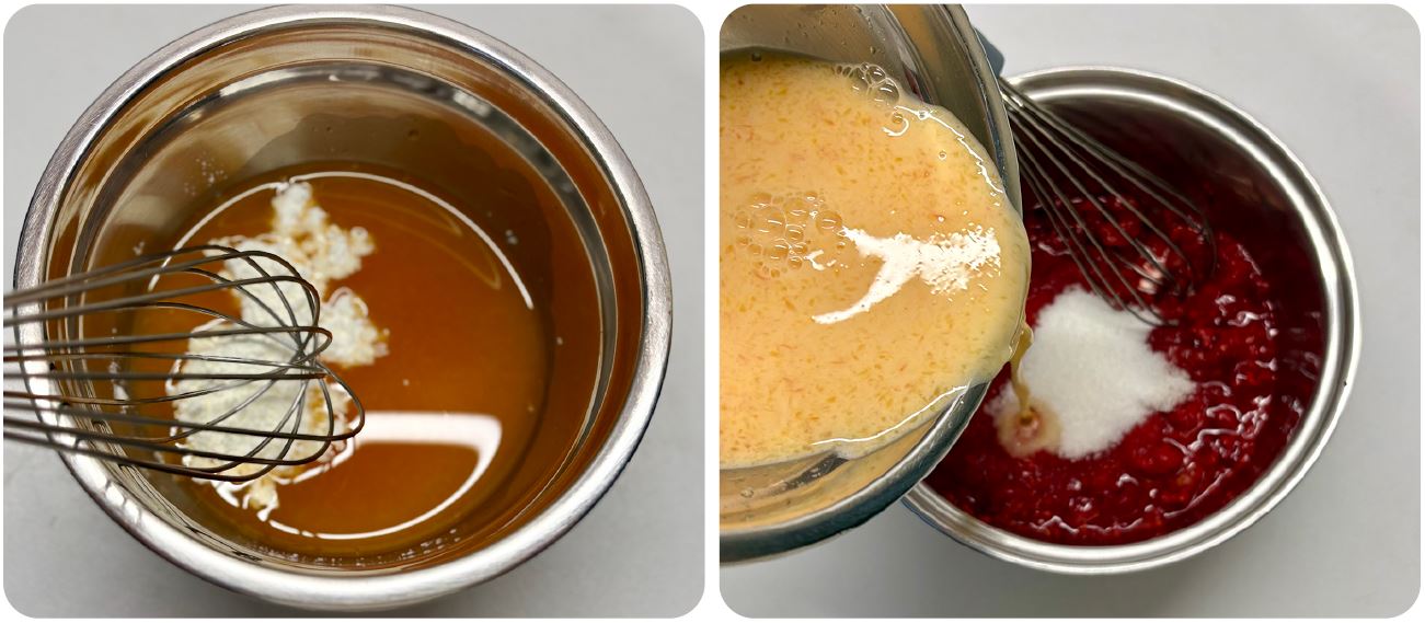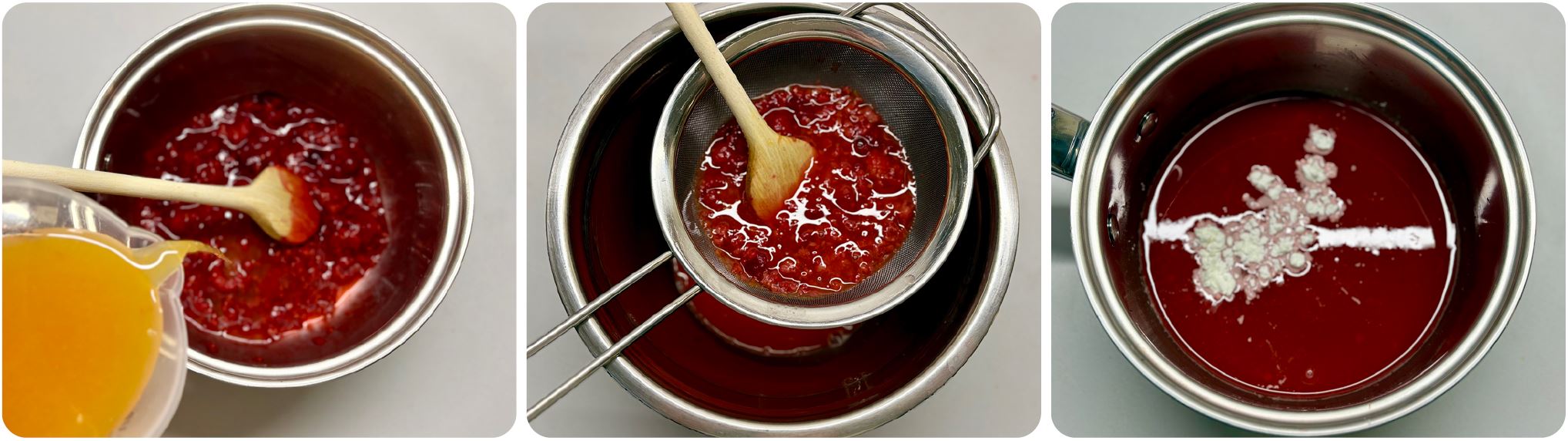 2. A málnakrémmel folytatjuk. A málnát felolvasztjuk és pürésítjük. A zselatinokat hideg vízbe áztatjuk. A keményítőt kikavarjuk a frissen facsart vérnarancslében és a málnához öntjük. Hozzáadjuk a kétféle cukrot is, és kavargatva sűrűre főzzük. Lehúzzuk a tűzhelyről és elkeverjük benne a kinyomkodott zselatinokat. Legalább langyosra hűtjük.