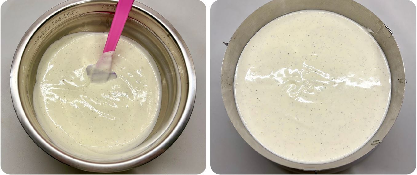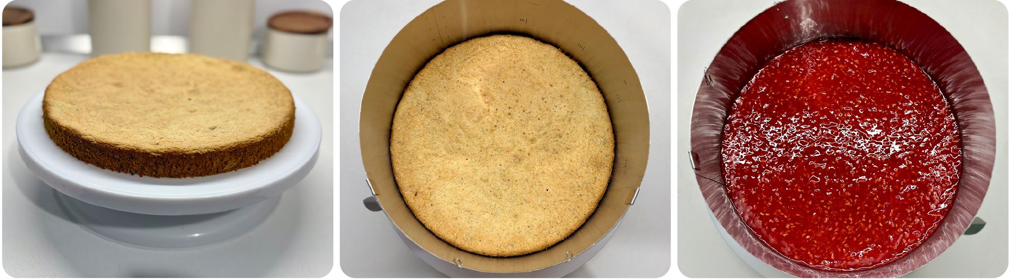 3. Elkezdjük a torta összeállítását. A piskótát tálcára tesszük, és köré szorosan egy állítható tortakarikát csatolunk. A málnakrémet a tésztára öntjük, egyenletesen elsimítjuk és hűtőbe tesszük, amíg a mousse készül.