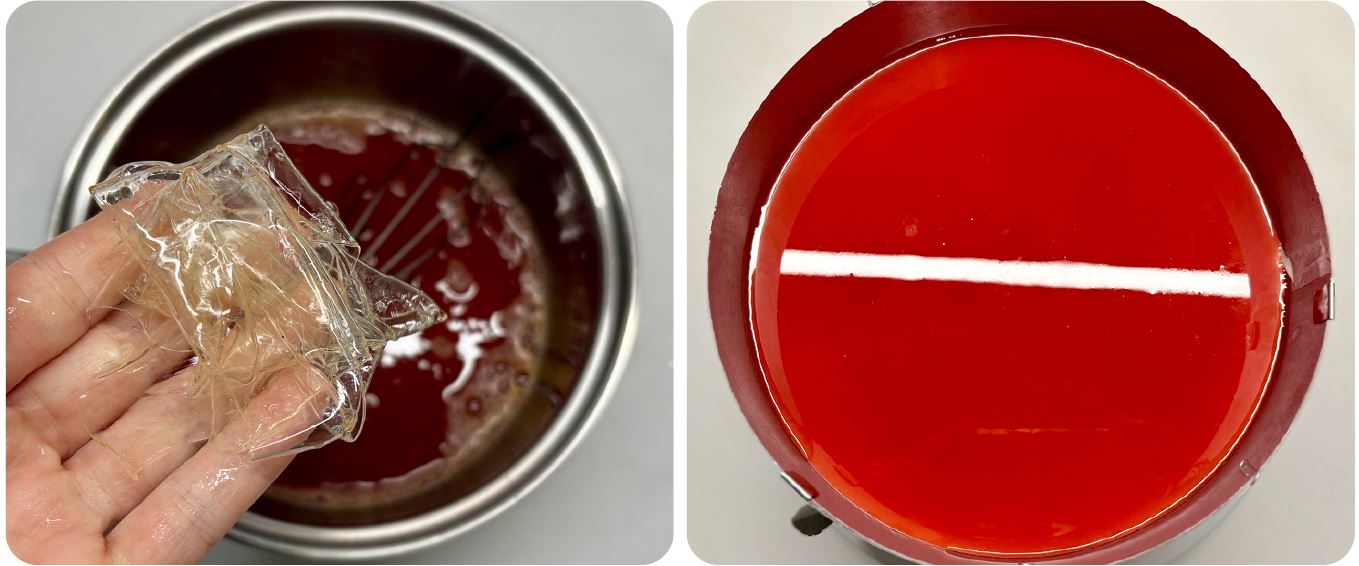 5. A tortát málnás vérnarancs zselé zárja. A zselatinokat hideg vízbe áztatjuk. A felolvasztott málnához adjuk a frissen facsart vérnarancslét és átszűrjük. Hozzáadjuk a kétféle cukrot, valamint a keményítőt és kikavarjuk. Kavargatva felforraljuk, majd lehúzzuk a tűzhelyről és elkeverjük benne a kinyomkodott zselatinokat. Kihűtjük, de még mielőtt dermedni kezd, ráöntjük a kefires rétegre. További 1-2 órára visszatesszük a hűtőbe, amíg meg nem húz.