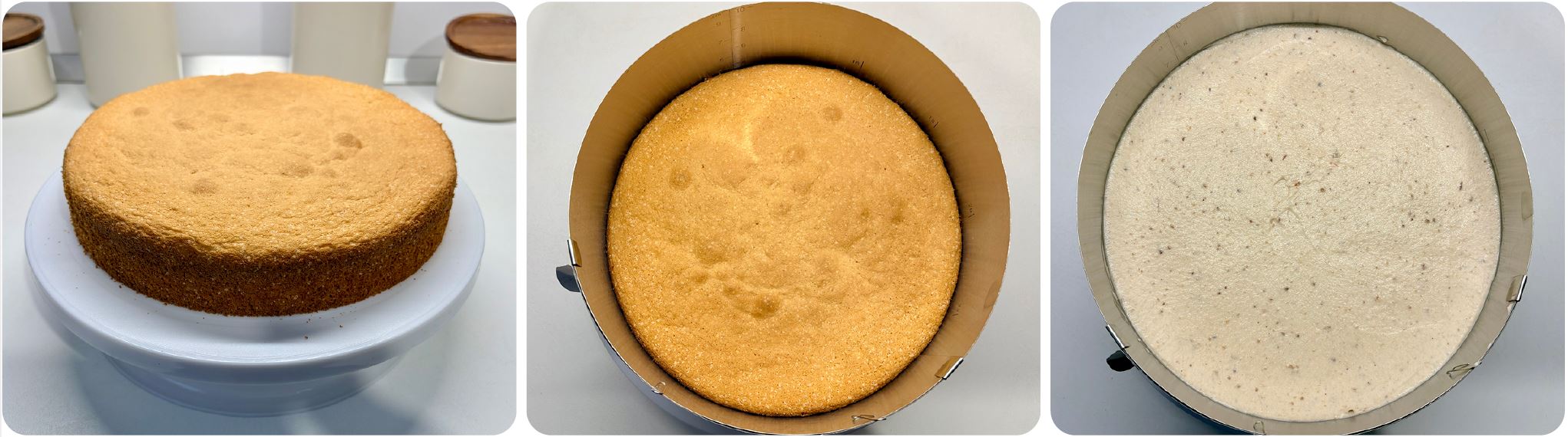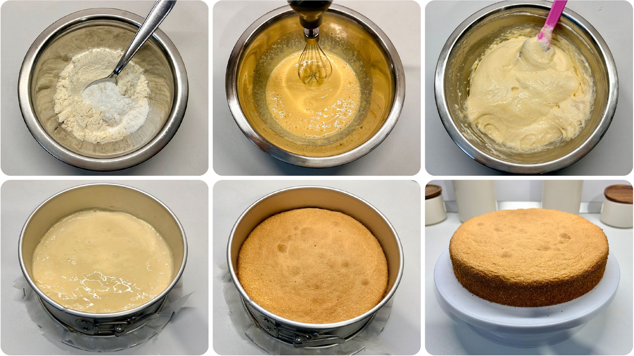 1. A piskótához a lisztet és a sütőport összekeverjük. A tojások fehérjét 20 g cukorral habbá verjük. A sárgáját a maradék cukorral kihabosítjuk, miközben hozzáöntjük a vizet is. A felvet fehérjét, és a száraz alapanyagokat felváltva adagolva forgatjuk a sárgájához. Egy 24 cm-es tortaforma alját sütőpapírral kibéleljük, és a masszát beleöntjük. Előmelegített, 175 fokos sütőben kb. 25 perc alatt megsütjük. Hagyjuk kihűlni.