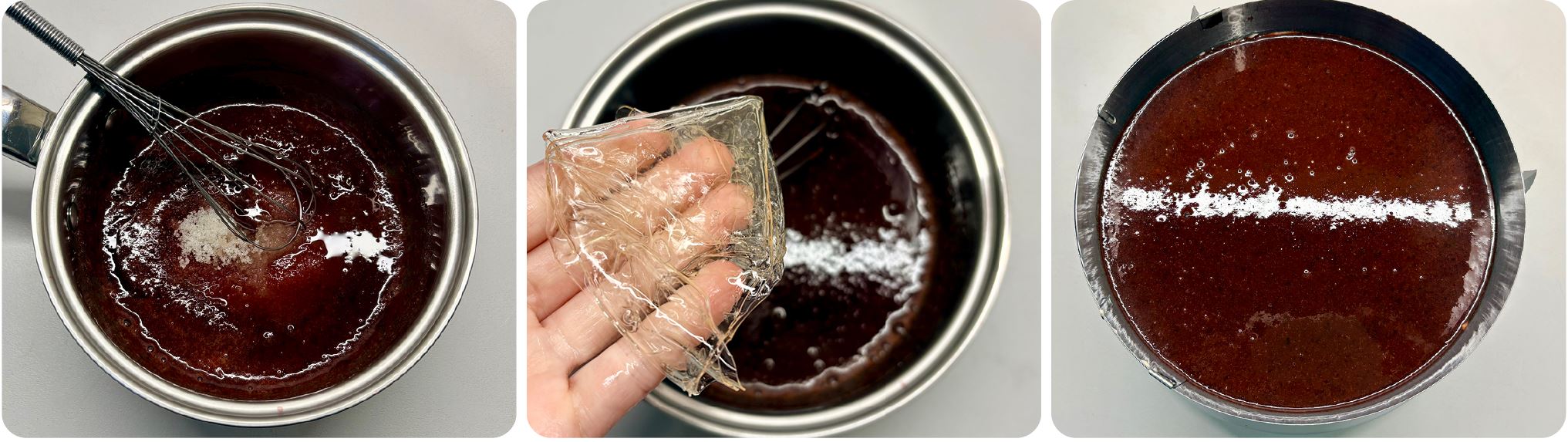 4. A rumos meggy réteghez a meggyet felolvasztjuk, és pürésítjük. A zselatinokat hideg vízbe áztatjuk. A meggyhez adjuk a kétféle cukrot, illetve a rumot és felfőzzük. Lehúzzuk a tűzhelyről és elkeverjük benne a kinyomkodott zselatinokat. Kihűtjük, de még mielőtt dermedni kezd, ráöntjük a gesztenyés rétegre. Visszatesszük a hűtőbe, amíg meg nem húz.