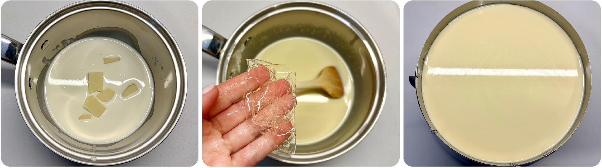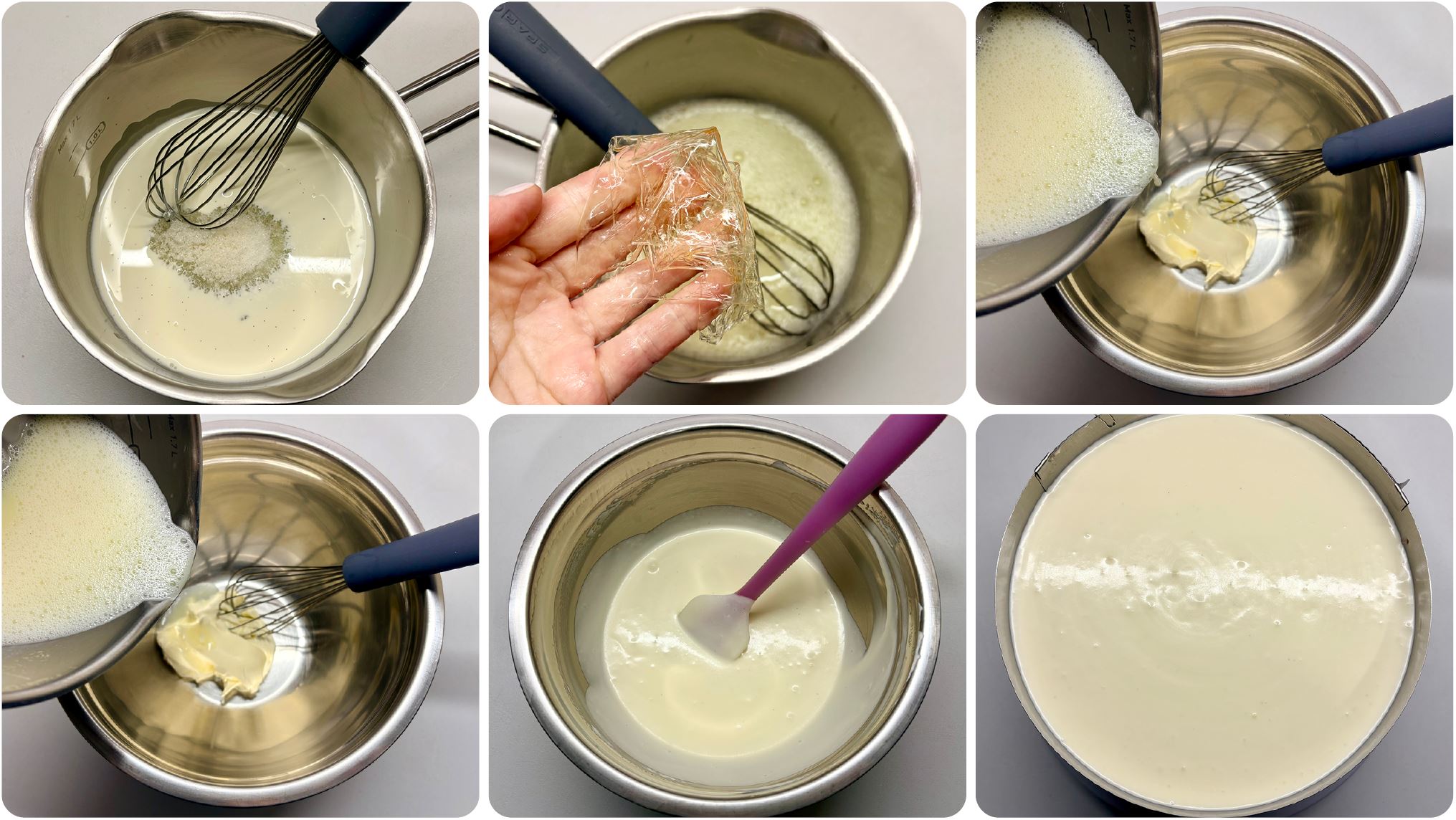 5. A vaníliás krémmel folytatjuk. A mascarponét egy keverőtálba mérjük. A zselatinokat hideg vízbe áztatjuk. Az 1 dl habtejszínhez adjuk a kétféle cukrot és felmelegítjük. Lehúzzuk a tűzhelyről és elkeverjük benne a kinyomkodott zselatinokat. Langyosra hűtjük és a mascarponéhez öntjük. Alaposan összekeverjük, végül hozzáforgatjuk a lágy habbá vert 1,5 dl habtejszínt. A kapott krémet a meggyre öntjük és egy éjszakára hűtőbe tesszük dermedni.