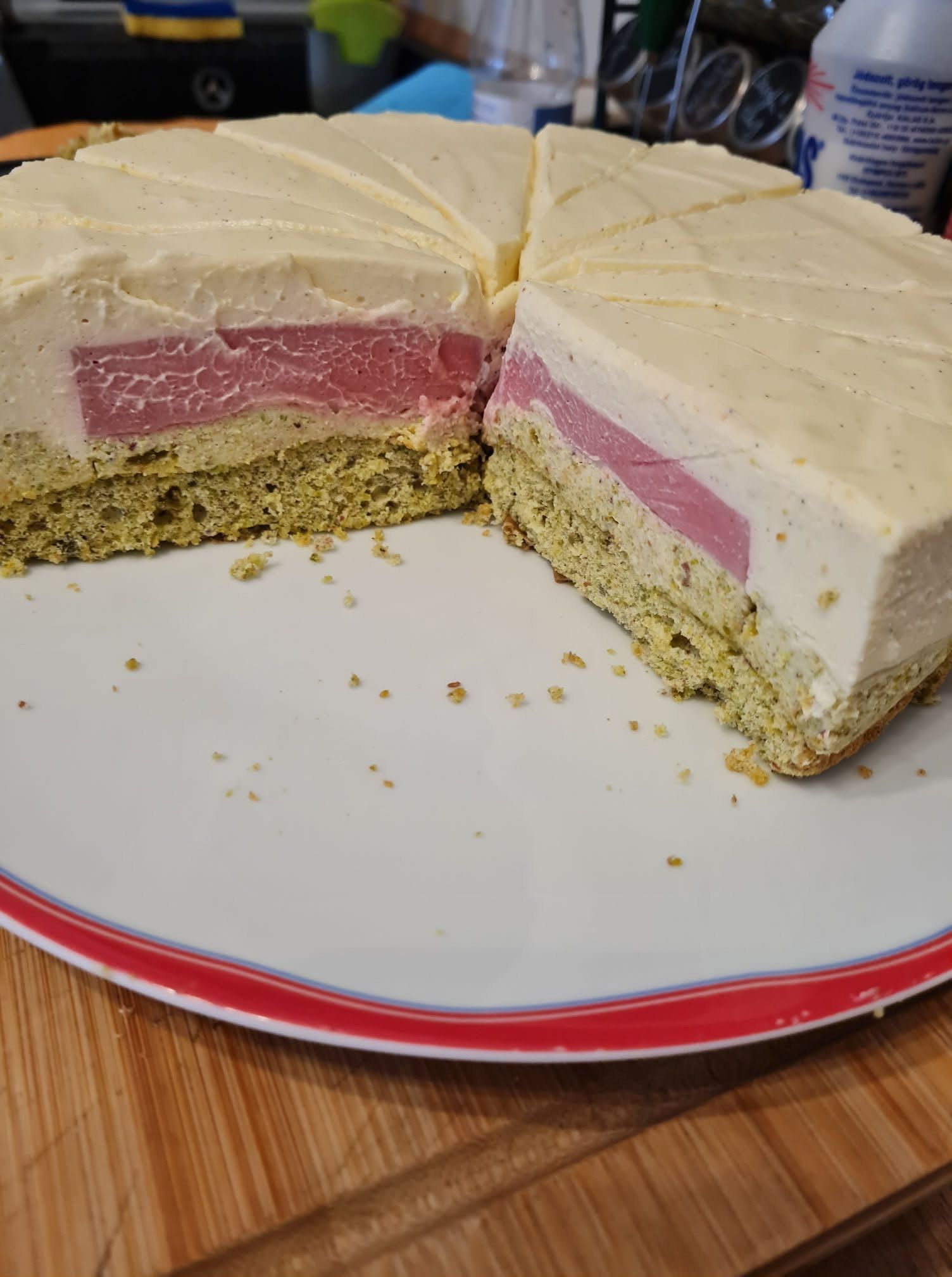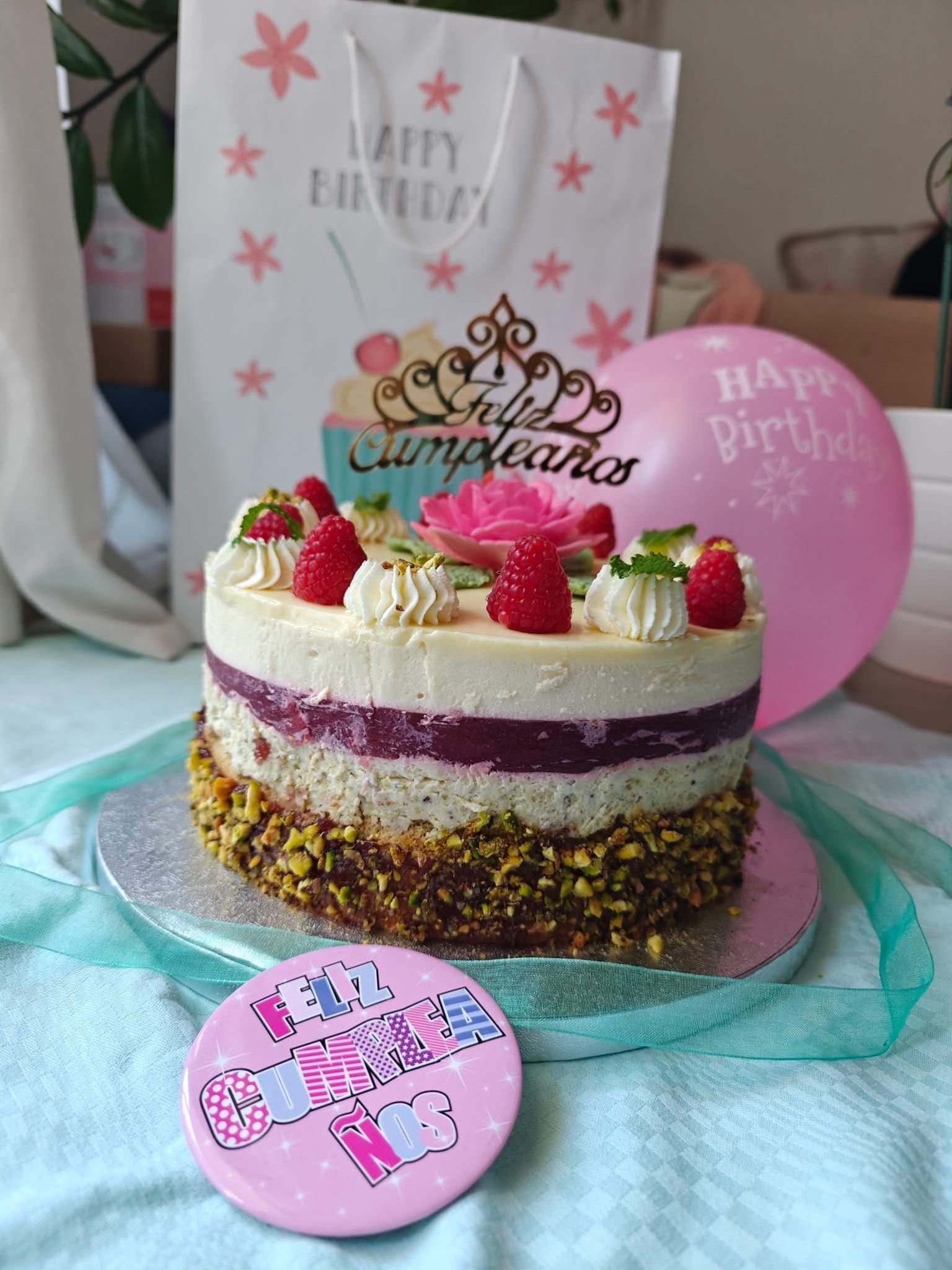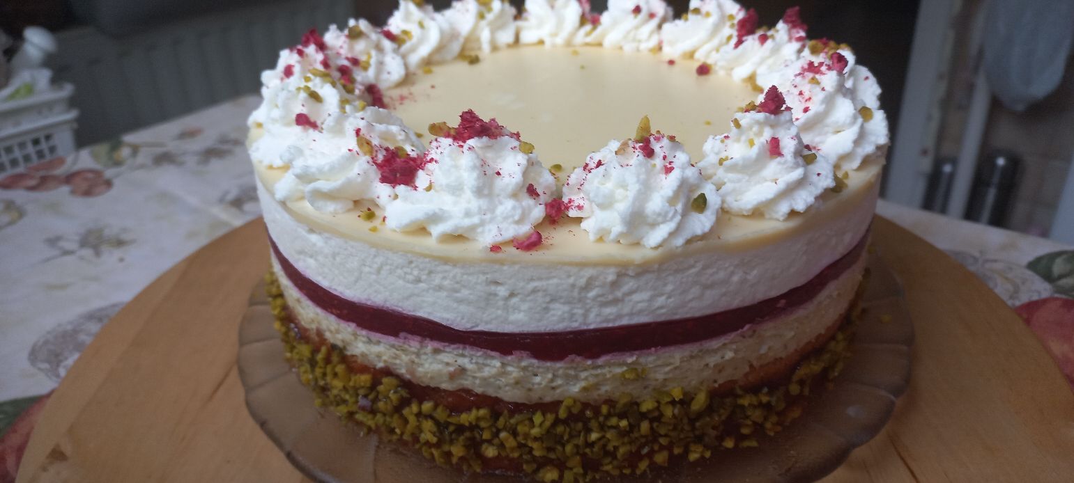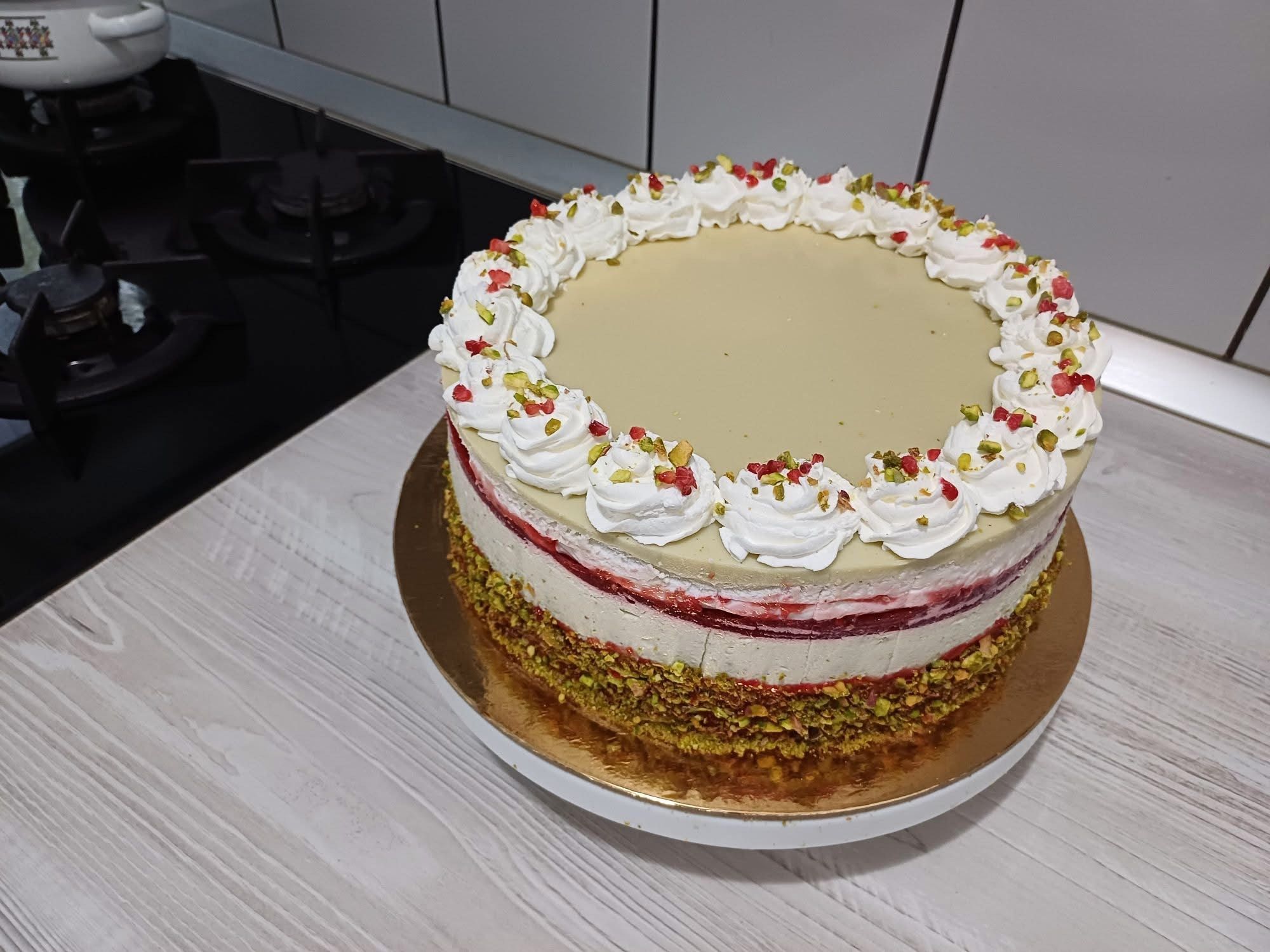 Drávuczné Király Juliannától :"Mézes vanília torta ,pisztáciával és málnával, mert nem volt áfonya itthon🙃"
